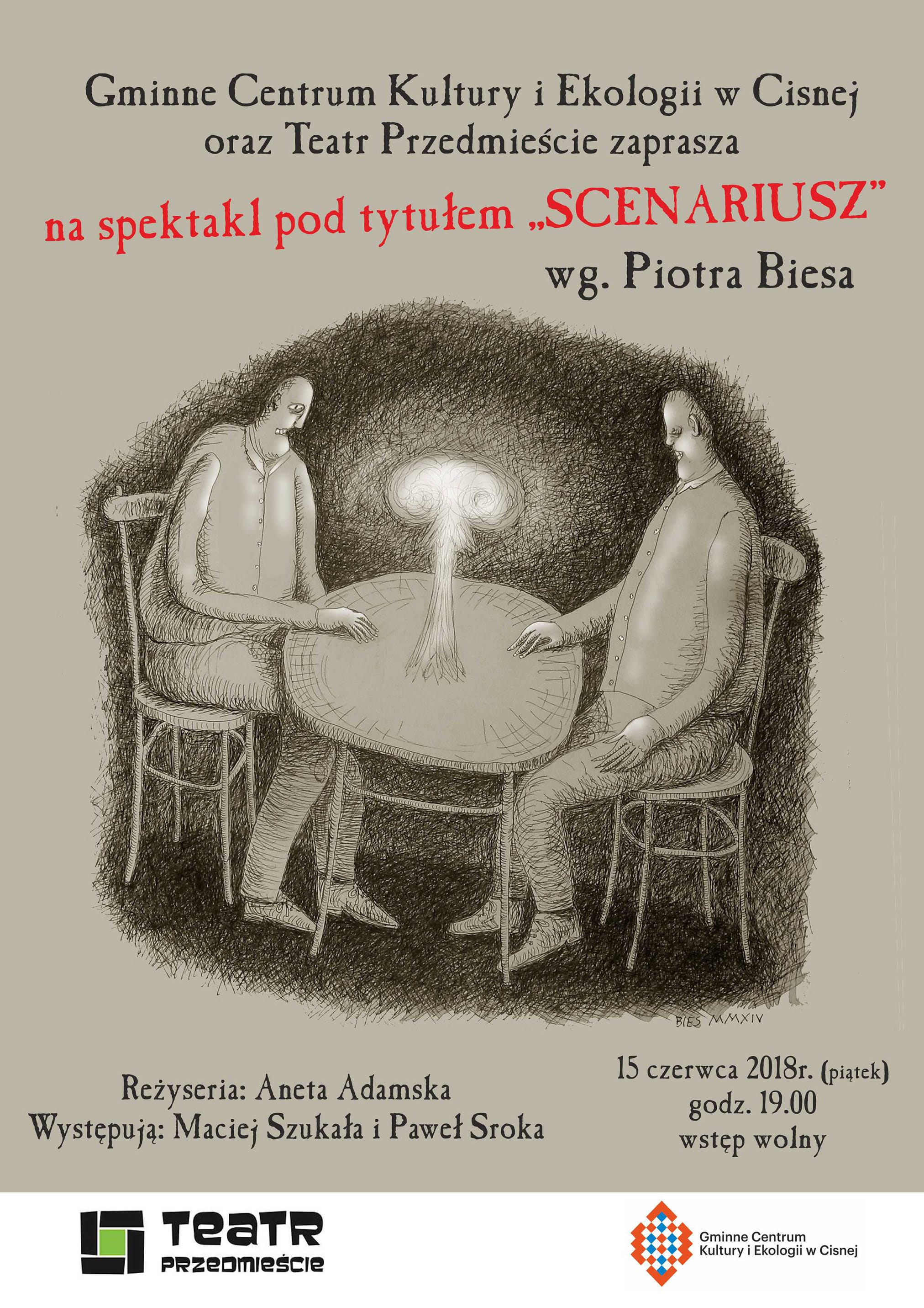„Scenariusz” autorstwa zakopiańskiego artysty- plastyka, dramaturga Piotra Biesa to słodko – gorzka opowieść o odwiecznej grze, jaka rozgrywa się pomiędzy dobrem a złem. Po wielkiej zagładzie ludzkości dwie zagadkowe „postaci” spotykają się, aby na nowo zbudować swój świat, napisać nowy scenariusz. Na różne sposoby rozważają alternatywną wersję Stworzenia snując domysły co by było, gdyby to nie Ewa, a Adam zerwał rajskie jabłko. Inteligentne i dowcipne dialogi przenikają się z zaskakująco trafnymi refleksjami na temat niezgłębionej natury człowieka. Sztuka stawia niewygodne pytania, burzy spokój powodując zamęt w naszym uporządkowanym świecie. Z pozoru niewinna miniatura sceniczna staje się na naszych oczach współczesnym moralitetem, ale może też być opowieścią o walce toczącej się w nas samych.