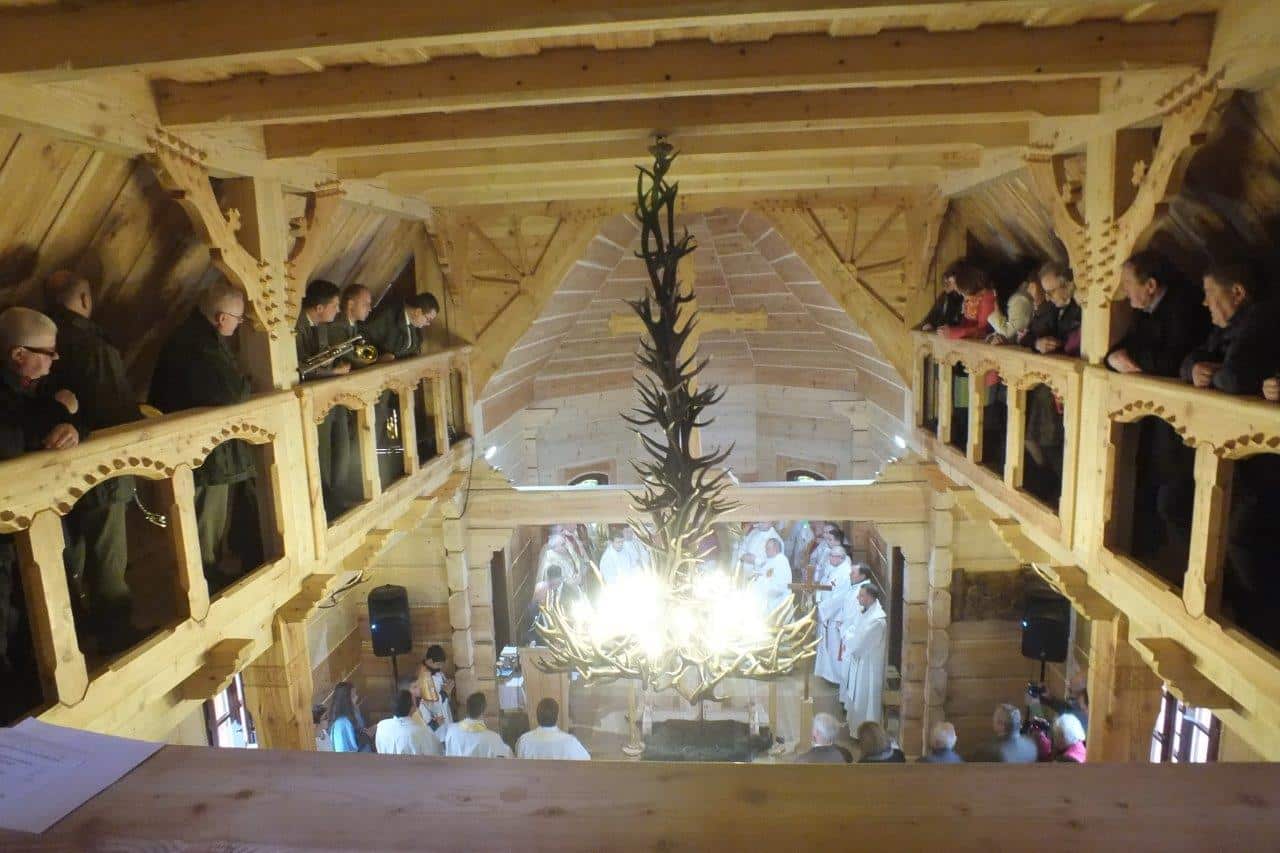 Prawdziwy kunszt pokazali jednak cieśle przy wykończeniu wnętrza świątyni – mnogość elementów zdobniczych może zachwycić najbardziej wybredne gusta. Elementem wystroju przyciągającym uwagę jest też oświetlenie wykonane ze zrzutów poroży jeleni.