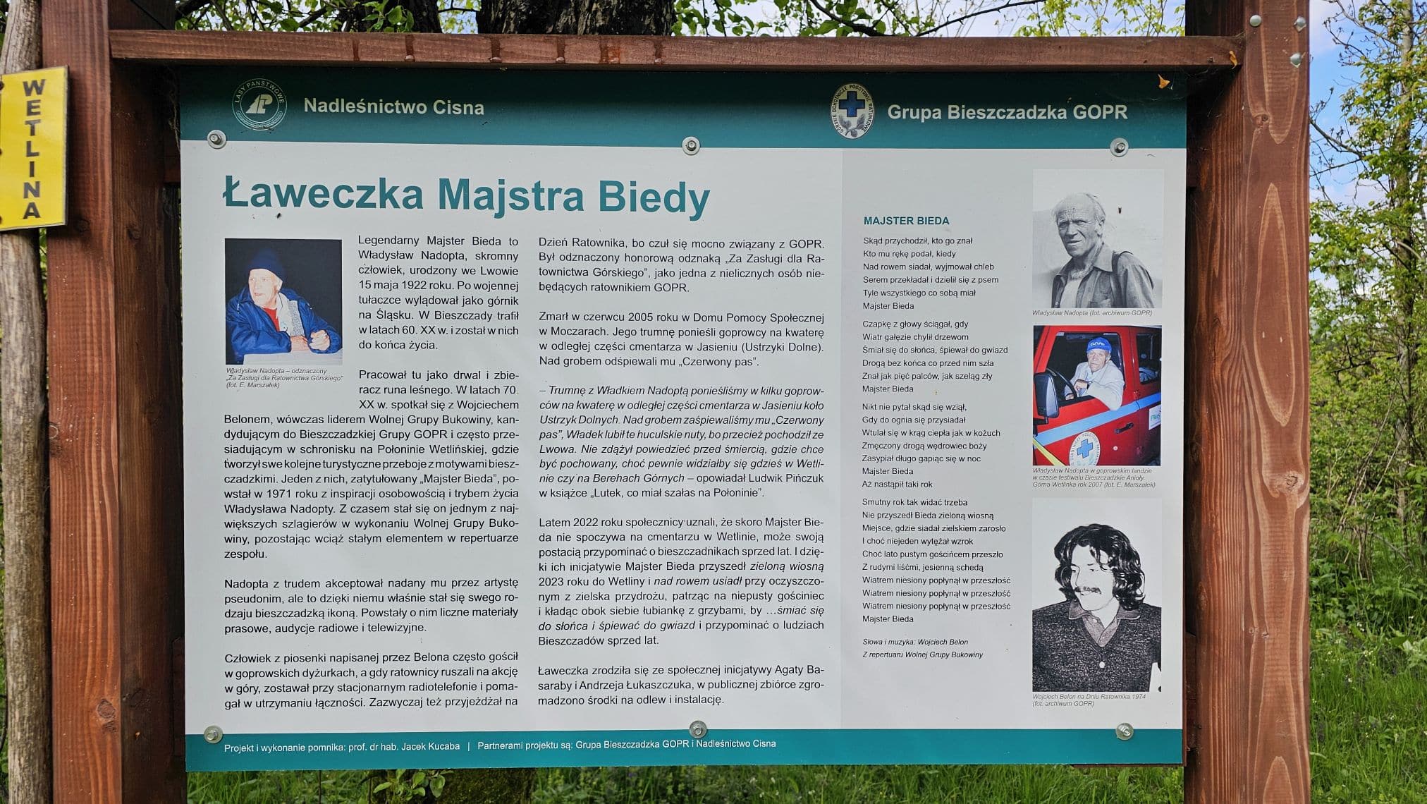 W Wetlinie warto zobaczyć Ławeczkę Władysława Nadopty, czyli słynnego Majstra Biedy. Bohatera piosenki Wojtka Belona, wówczas lidera zespołu Wolna Grupa Bukowina. Ławeczka zrodziła się ze społecznej inicjatywy Agaty Basaraby i Andrzeja Łukaszczuka, w publicznej zbiórce zgromadzono środki na odlew i instalację. Pomysł wsparło Nadleśnictwo Cisna i Grupa Bieszczadzka GOPR a wykonania rzeźby według własnego projektu podjął się prof. Jacek Kucaba z ASP w Krakowie. Ławeczka stanęła na terenie udostępnionym przez Nadleśnictwo Cisna u wejścia szlaku turystycznego na Przełęcz Orłowicza.
