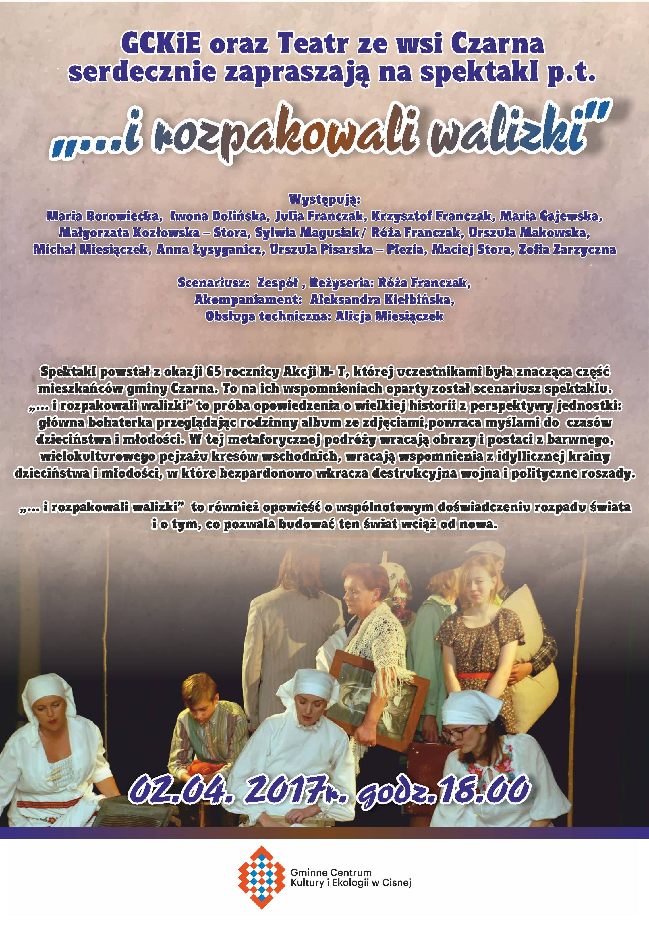 Gminne Centrum Kultury i Ekologii w Cisnej serdecznie zaprasza na spektakl powstał z okazji 65 rocznicy Akcji H- T, której uczestnikami była znacząca część mieszkańców gminy Czarna. To na ich wspomnieniach oparty został scenariusz spektaklu.