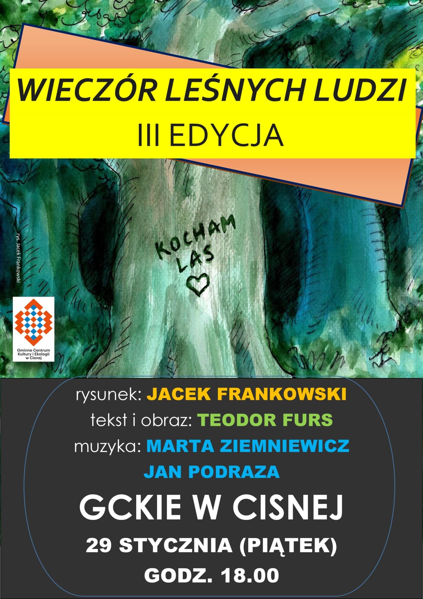W dniu 29 stycznia br. o godz. 18 w Galerii Przy Pętli (siedziba GCKiE w Cisnej) odbędzie się już trzeci raz z rzędu coroczne spotkanie z cyklu „Wieczór Leśnych Ludzi”. Wydarzenie to ma na celu integrację środowiska zawodowych leśników oraz promocję ich – jak się okazuje – wszechstronnych i bogatych pasji artystycznych „leśnej braci”.